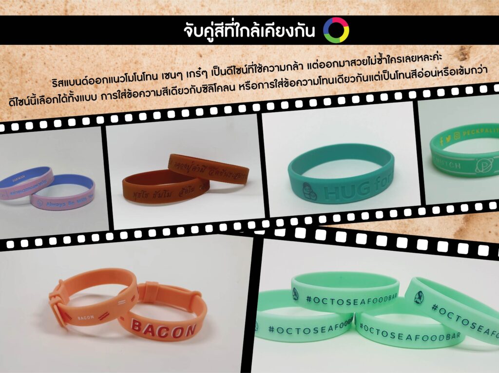 ริสแบนด์ออกแนวโมโนโทน เกร๋ๆ เป็นดีไซน์ที่ใช้ความกล้า แต่ออกมาสวยไม่ซ้ำใครเลยหละค่ะ ไม่ว่าจะเป้นริสแบนด์สกรีน ริสแบนด์ปั้มจม ริสแบนด์ปั้มนูน ก็เป็นที่นิยม ดีไซน์ลักษณะนี้เลือกได้ทั้งแบบการใส่ข้อความสีเดียวกับซิลิโคลน หรือการใส่ข้อความโทนเดียวกันแต่เป็นโทนสีอ่อนหรือเข้มกว่า
