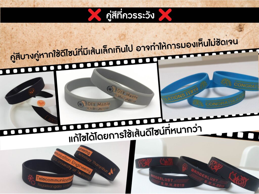 สำหรับสีของสายริสแบนด์บางสี หากใส่กับข้อความสีที่ไปในโทนเดียวกัน อาจจะทำให้เกิดความจมของสี สร้างความไม่เด่นชัดให้กับข้อความหรือโลโก้ที่อยู่บนริสแบนด์ ในบางกรณีหากเส้นของดีไซน์เล็กเกินไปก็จำทำให้เกิดปัญหาดังกล่าว แนะนำให้ใช้เส้นของดีไซน์ที่หนาขึ้นเพื่อสร้างความโดนเด่นของริสแบนด์มากยิ่งขึ้น แต่ไม่ต้องกังวลค่ะ ทางทีมงานจะคอยแนะนำเรื่องเหล่านี้ให้กับลูกค้าอยู่แล้ว ตัวอย่างการปรับดีไซน์เพื่อเพิ่มความสวยงาม