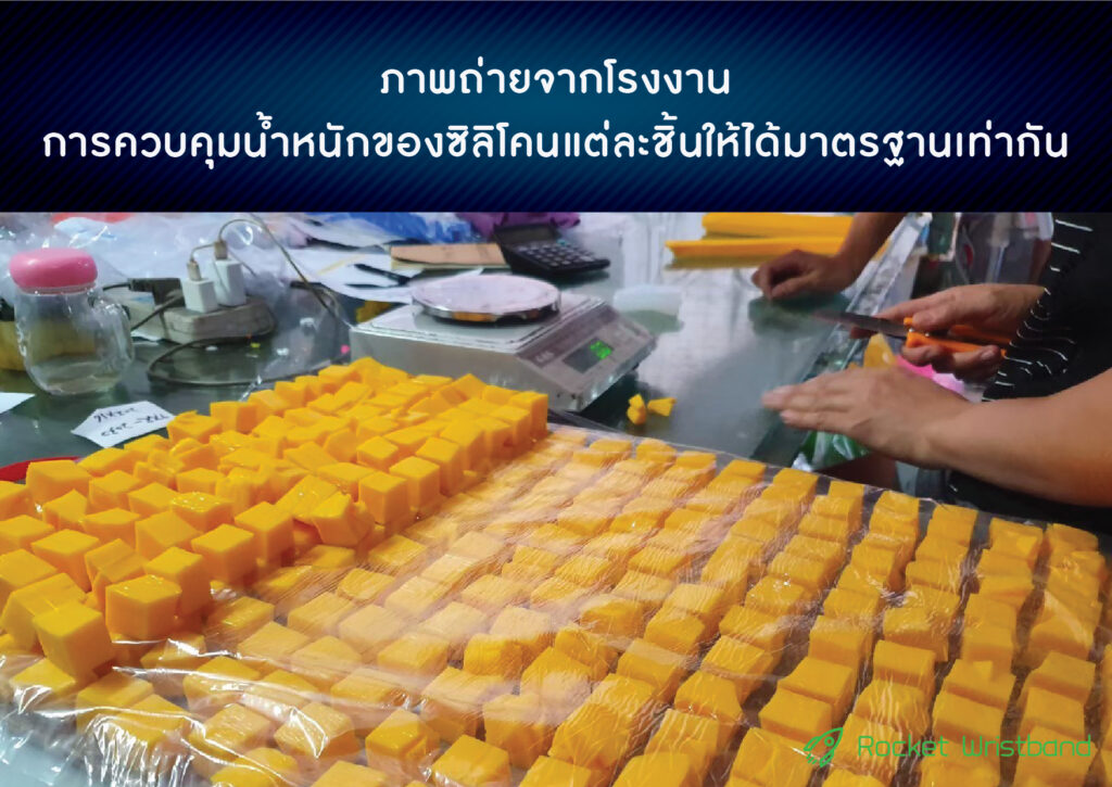การควบคุมคุณภาพสินค้าเป็นเรื่องสำคัญ ไม่ว่าจะเป็นการผลิมสีซิลิโคน รวมถึงน้ำหนักและขนาดของริสแบนด์ ซิลิโคนที่ถูกผสมสีเสร็จแล้วก่อนที่จะนำมาขึ้นรูปริสแบนด์ทุกชิ้นจะถูกชั่งน้ำหนักเพื่อให้ได้ริสแบนด์ขนาดมาตรฐานเท่าๆ กันค่ะ เมื่อได้นำ้หนักที่ต้องการแล้วจึงนำไปขึ้นกับพิมพ์ริสแบนด์ในขั้นตอนต่อไปค่ะ