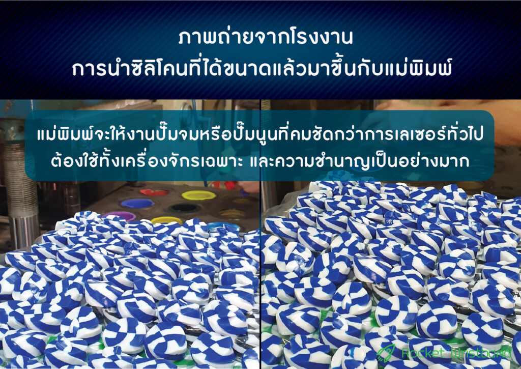 ขั้นตอนสำคัญที่ต้องใช้ความชำนาญและเครื่องจักรเฉพาะ คือการขึ้นซิลิโคนกับแม่พิมพ์ค่ะ ริสแบนด์ปั๊มจมและปั๊มนูนของเราจะมีความคมชัด เส้นสวยเรียบ นูนหรือลึกได้ตามมาตรฐานเนื่องจากเราผลิตโดยแม่พิมพ์ค่ะ ไม่ได้ใช้การยิงเลเซอร์ทั่วไป ทั้งนี้ต้องใช้เครื่องจักรเฉพาะและอาศัยความชำนาญอย่างมาก ด้วยต้องใช้ความร้อนที่พอเหมาะในการขึ้นรูปซิลิโคนริสแบนด์ค่ะ