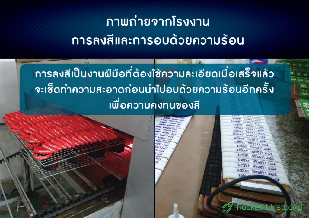 สำหรับริสแบนด์ที่มีการลงสีลงในข้อความปั๊มจม การลงสีเป็นงานฝีมือที่ต้องใช้ความละเอียด เมื่อใส่สีเสร็จจะมีการเช็ดทำความสะอาด ก่อนที่จะนำไปอบด้วยความร้อนอีกครั้งเพื่อเพิ่มความคงทนของสีข้อความและโลโก้ค่ะ